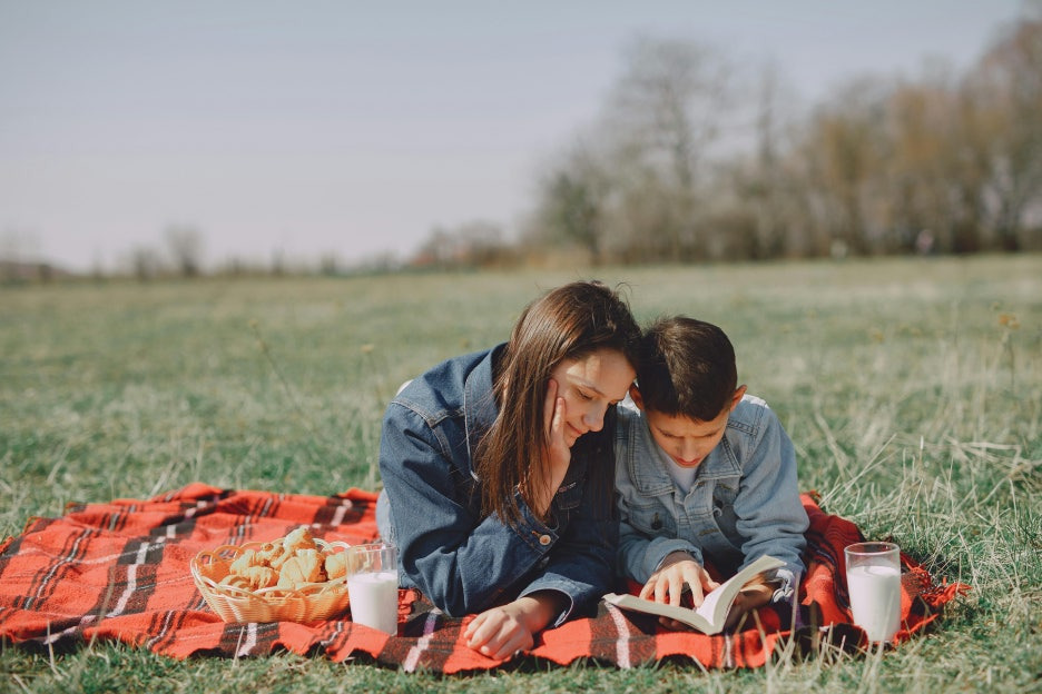 이 사진을 보면 어떤 것이 떠오르시나요? 잔디 위에 돗자리 깔고 느긋하게 쉬는 날이 떠오르네요. 바람은 선선한데 햇빛은 따뜻해서, 괜히 책 한 권 펼치고 싶어질 때가 있죠. 이런 순간은 “아무것도 안 해도 괜찮다”는 느낌을 줍니다. 사진에 대한 한국어 묘사 이 사진은 넓은 들판 같은 야외에서 찍힌 사진으로 보입니다. 전체적으로 초록 잔디가 넓게 펼쳐져 있고, 멀리 나무들이 흐릿하게 보여 한적한 교외 풍경 같아요. 사진의 중심에는 두 사람이 빨간 체크 담요 위에 엎드리듯 누워 책을 함께 보고 있습니다. 한 사람은 턱을 괴고 부드러운 표정으로 페이지를 따라가고, 옆 사람은 고개를 숙인 채 집중해서 책을 읽는 모습이에요. 주변에는 바구니에 담긴 빵과 두 잔의 우유가 놓여 있어 작은 피크닉처럼 느껴집..